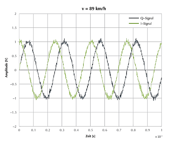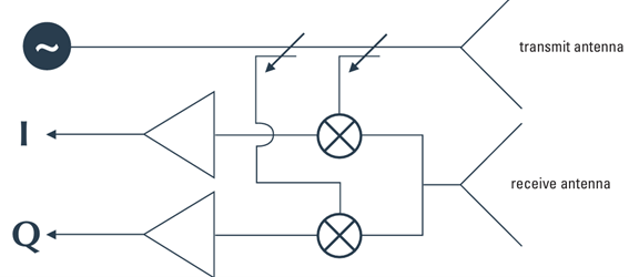 I/Q出力まわりの回路構成は、従来型のドップラーレーダーとよく似ています。測定される信号周波数も、ドップラー装置と同じ帯域内に存在します。