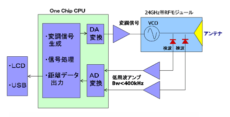 一般に、従来の測距レーダはコストが高いため、その普及の妨げとなり応用分野が限られているのが現状です。また、近距離の測定が困難となっています。