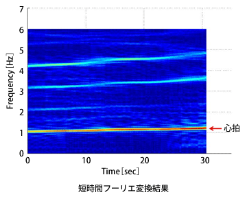 信号処理を行うことにより、1Hz付近に心拍と考えられる周波数の時間的変化をみることができる。