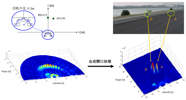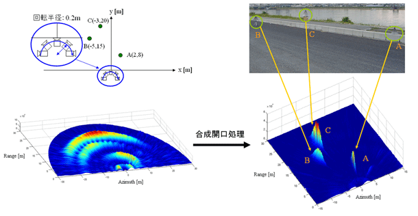 Radarを横方向(アジマス方向)に移動させながら測定し、採取データを合成開口処理することによって、正確なターゲットの位置・方向を知ることが可能